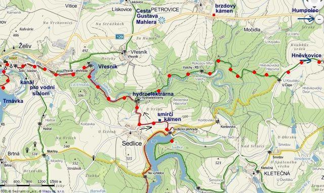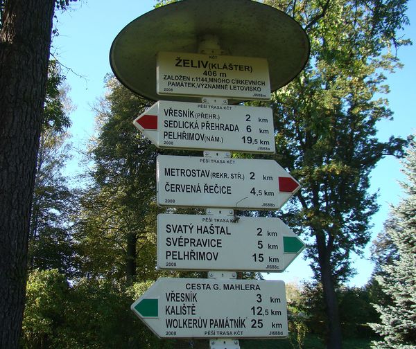 Do parčíku poblíž sochy Želivského umístili značkaři směrovník, z něhož vyčteme, že zde začíná (či končí) zeleně značená Cesta Gustava Mahlera, dnes právě pětiletá. Začátek cesty vede turisty po opačném břehu Želivky nežli je červeně vyznačená cesta kolem přehrad, které se dnes budeme držet my.