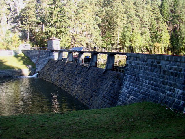 Kamenná hráz, nepřístupná pro veřejnost, je dlouhá 80 metrů, výška nad řečištěm je pět metrů.