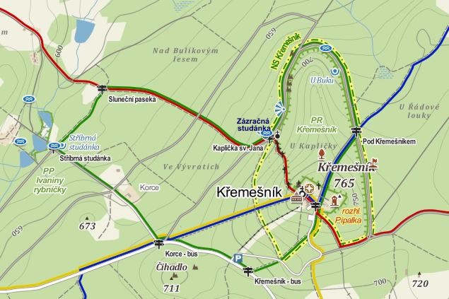 Ačkoliv poznávací okruh není nijak dlouhý, kvůli nedostatku času jsme Stříbrnou studánku ani tu U Buku nenavštívili, a na vrcholek Křemešníku se zase navraceli po asi kilometr dlouhé křížové cestě se třinácti zastaveními (reliéfy v kapličkách dělal Viktor Foerster, bratr známějšího hudebního skladatele) a Božím hrobem v jeskyni blízko vrcholku Křemešníku (tělo Krista vytesal sochař Antonín Bílek, bratr Františkův).