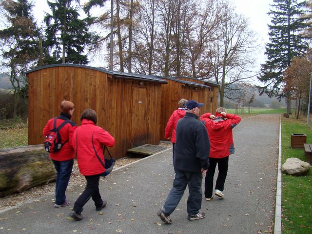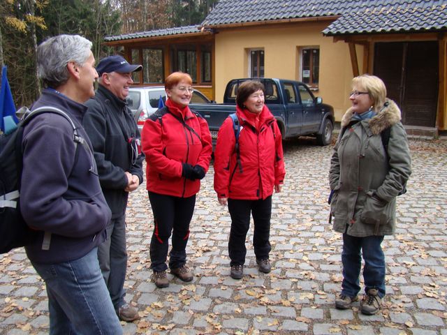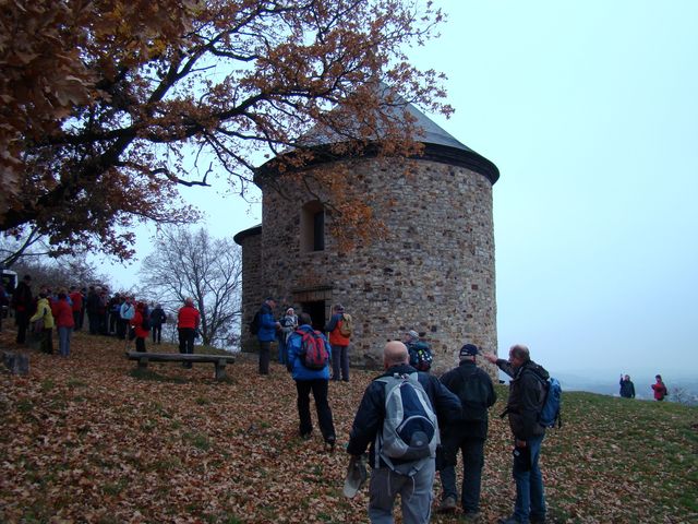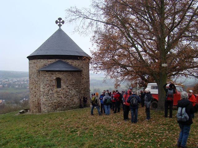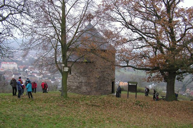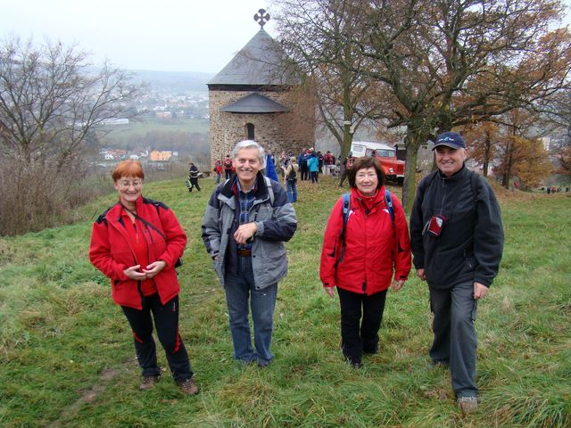 Třetí den pobytu na Plzeňsku byl ten pravý „puchýřový“, v sobotu 17. listopadu 2012 nám pořadatelé nabídli čtyři trasy různých délek, všechny však procházely dvěma ústředními body – Hůrkou s přemyslovským hradištěm a Radyní s lucemburským hradem. Vybrali jsme si trasu dlouhou 22 kilometrů se startem u nádraží ve Starém Plzenci, kam jsme se dostali busem. Atrakce číslo jedna byla rotunda sv. Petra a Pavla z konce 10. století na kopci Hůrka.