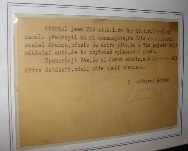 V muzeu jsme viděli několik ukázek obchodní korespondence, z rozvernosti uvádím jeden případ.