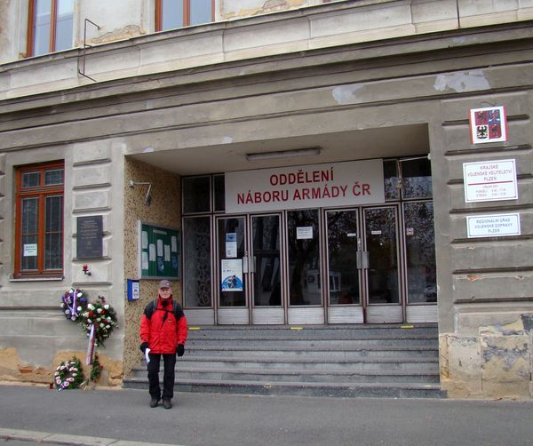 nejdříve kolem řeky Radbuzy, pak jsme přešli Doudleveckou a Papírenskou lávku, dostali se do města a zjistili, že značení je výborné a spolehlivě nás vede jedenáctikilometrovou trasou vnitřní Plzní. První zastávka byla před kasárnami, kde sloužil Mirek, když ho vzali za vojáka.