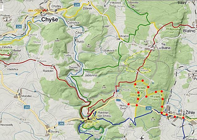 V údolí jsme přejeli po mostě na protější břeh řeky Střely a pěšky se vydali na asi čtyřkilometrovou vycházku Rabštejnskou pahorkatinou k Žihli, abychom se v přírodním parku potěšili pohledem na kamenné výtvory přírody vzniklé zvětráváním.