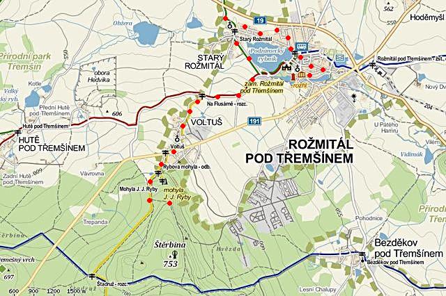 Možná mám bohatou fantazii, ale pobyt v tomto lese byl tísnivý a pocit zmaru, kterému podlehl uštvaný člověk, se mě bytostně dotýkal. Na zaplašení chmur jsme měli asi čtyřkilometrovou cestu do Starého Rožmitálu, jíž chodíval jistě i místní kantor Ryba.
