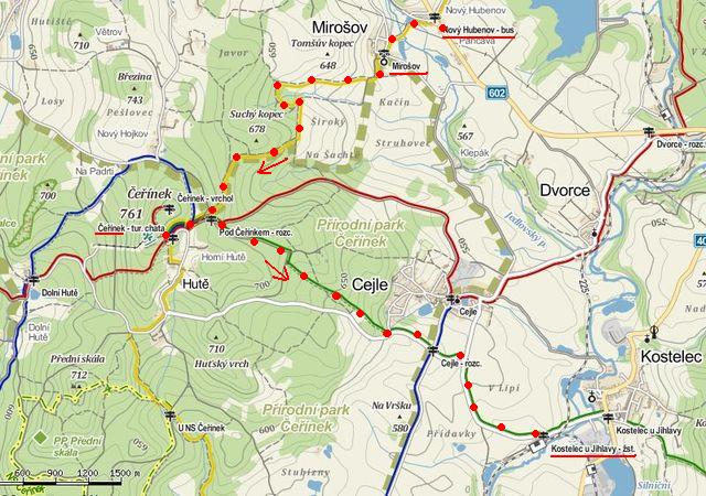 Většina jich jela z Jihlavy do Nového Hubenova autobusem a tam se vydali čtyři a půl kilometru po žlutě značené cestě nahoru na Čeřínek; zpět se vraceli pět kilometrů po zelené značce do Kostelce, odkud jeli do Jihlavy vlakem.