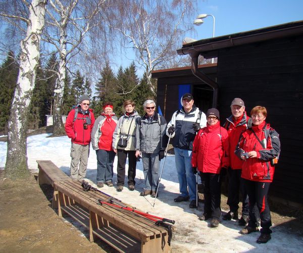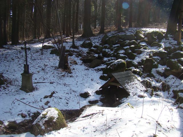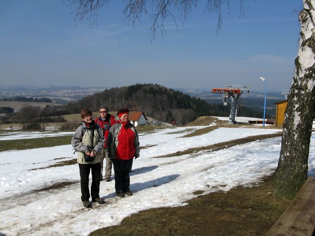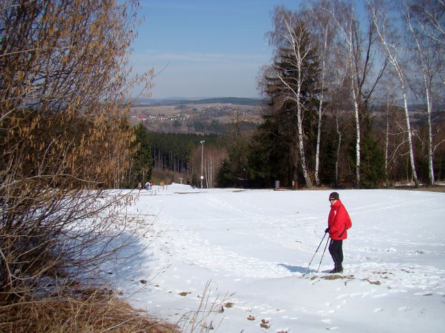 Ve Svatém Kříži jsme na hřbitově postáli u hrobu rodiny Reynkových a pak zeleně značenou cestou pokračovali pět kilometrů na Vysokou, kde dosud panovala na 400 metrů dlouhé sjezdovce na svahu s převýšením 90 metrů, obráceném k severu, zima.