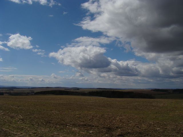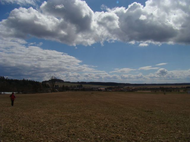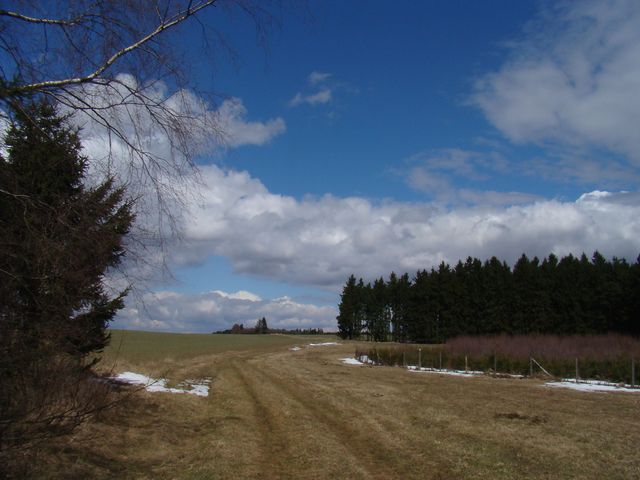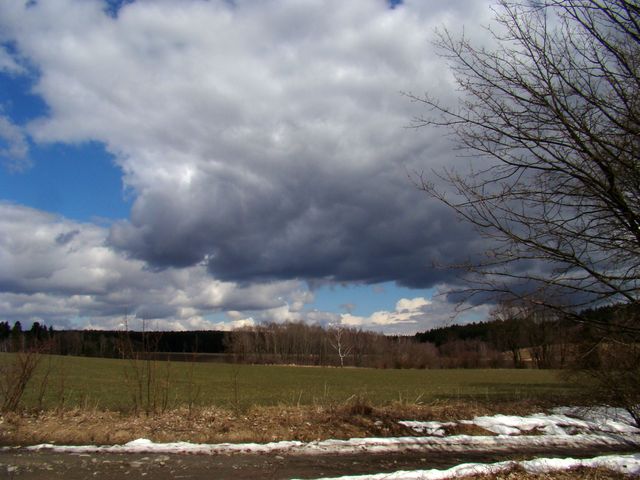 Během chvilky vysvitlo, a po zbytek dne se udrželo, pichlavé jarní slunce a my jsme si užívali ostré přechody mezi barvami i dramatická oblaka, do toho silný vítr vysušující cesty, na kterých místy ještě ležel sníh.