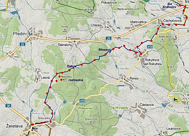 Trasa: Krahulov – Čechočovice – Rokytnice nad Rokytnou – Březová – Dašov – Mařenka – Bítovánky – Želetava = 21 km