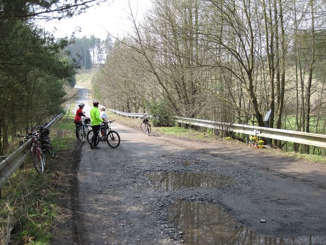 Rozjetý z prudkého vrchu skončil P. Jeroným ve výmolech, které tu na oficiální cyklostezce doposud jsou a hrozí.
