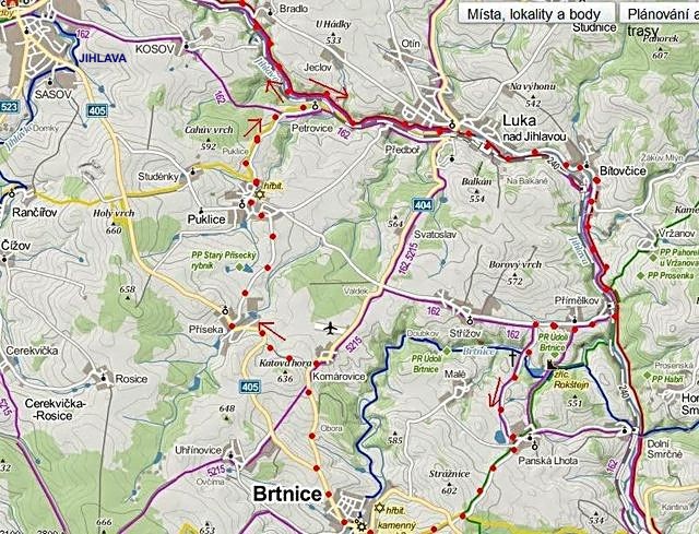 Jihlava – Luka – Bítovčice – Přímělkov – Panská Lhota – Brtnice – do Příseky přes Katovu horu nad Komárovicemi (636 m) – Puklice – Petrovice – po cyklostezce do Jihlavy – Bedřichov = 57 km