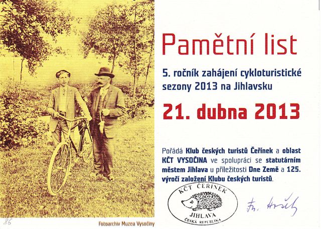 Historická fotografie na pamětním listu by měla připomínat, že letos je to už 125 let, kdy byl založen Klub českých turistů (1888) a že kdysi byli velocipedisté jeho významnou složkou.