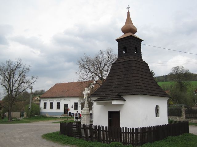 Původ kapličky Panny Marie je prý kladen už do 14. století, stavba, která je dominantou návsi, je však ze století devatenáctého, kříž vznikl v roce 1867 a je proveden v bělostném nedvědickém mramoru, škola v pozadí je z konce 19. století.