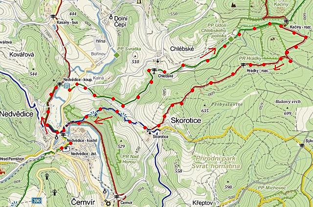 Trasa: Nedvědice ZTZ – Chlébské – Káčiny ČTZ – Hrádky – Skorotice MTZ – Nedvědice = 15 km