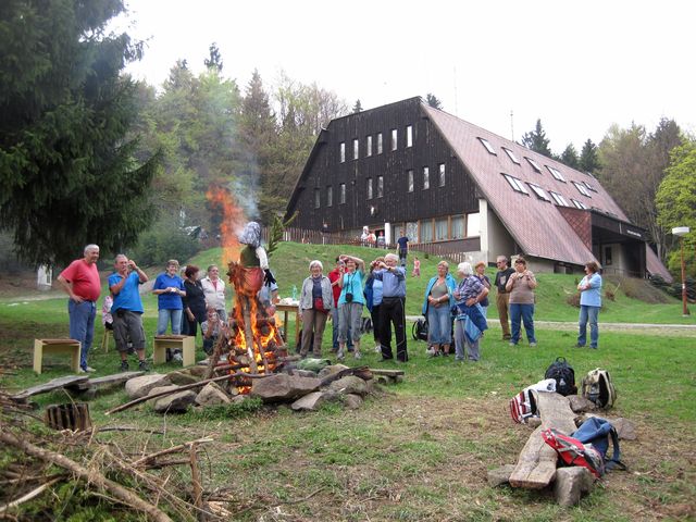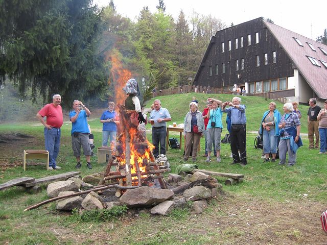 Nejsem pávě příznivcem podobných akcí (jako horlivá čtenářka s dosti velkou fantazií jsem už od dětství nedokázala najít v ohních, kde byli upalováni lidé, pražádné zalíbení; stejně vážně jsem brala masopustní masky a pociťovala jsem velký rozpor mezi jejich vzezřením a rozpustilým chováním – něco z toho se mi usadilo v nitru a doposud intuitivně, bez ohledu na logiku, trvá; při dodržování tradic mám raději úsporná nežli okázalá gesta), ale když se turisté z našeho odboru rozhodli na Čeřínku „upálit čarodějnici“, brali jsme to jako příležitost k setkání s přáteli.