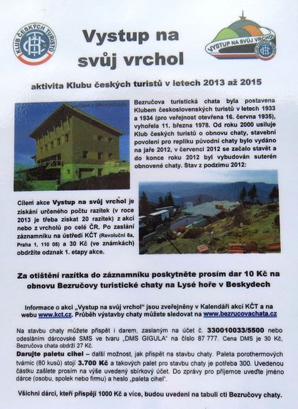 Součástí dnešního pátého hvězdicového pochodu na Čeřínek byla i akce Vystup na svůj vrchol, proto turisté finančně podpořili výstavbu Bezručovy chaty na Lysé hoře v Beskydech.