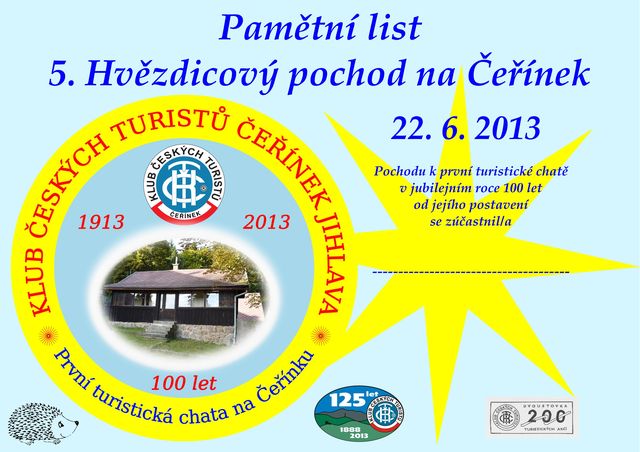 Středem pozornosti však byla tzv. „malá“ chata, která se ve výborné kondici dožívá v těchto dnech sta let – se zájmem si ji prohlédli a historické zajímavosti od pořadatelů vyslechli mnozí pochodníci. Jako vzácný suvenýr si sběratelé odnášeli novou turistickou dřevěnou známku vydanou ke 100. výročí postavení první turistické chaty na Čeřínku a spokojeni byli i ti, kdo ve svých záznamnících shromažďují turistické vizitky – v nabídce jsou obrázky zdejších chat v letní i zimní variantě.