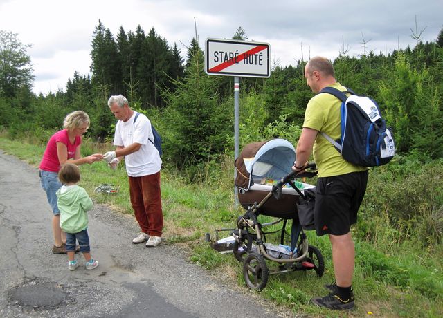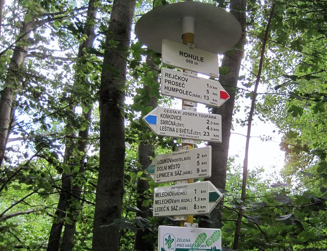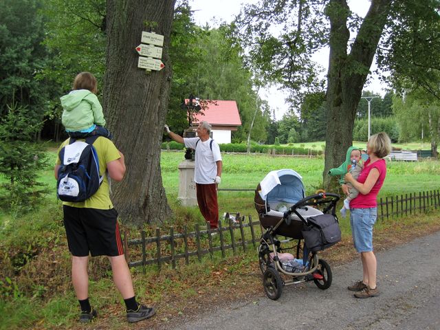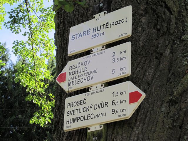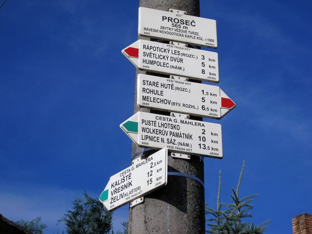 Začínali jsme u směrovníku v Proseči, tam, kde se červená trasa křižuje se zeleně značenou Cestou Gustava Mahlera, na níž jsme obnovovali značení v roce 2010 (M+M Svatošovi – Značení na Cestě Gustava Mahlera) a už několikrát ji s turistickými výpravami prošli (M+M Svatošovi – Cesta Gustava Mahlera 2009, Stezky Vysočiny 2010).
