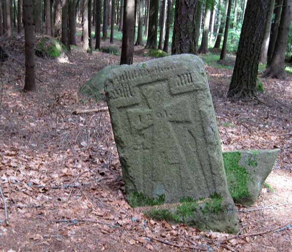 Jelikož plním záznamníky Kamenné kříže,tak jsem si o nich pořídila i knihu Kamenné kříže Čech a Moravy.Po přečtení toho „značkařského “ výletu jsem hned po ní šáhla a o kamenném kříži jsem našla v knize tento popis: č.0899 Staré Hutě.Žulová deska obsahuje na přední straně vystupující reliéf kříže s rozšiřujícími se rameny a hlavou na klínové noze.Pod břevnem vpravo kopí,nalevo meč,uprostřed bojová sekera.Toto vše v zahloubeném reliéfu.Na břevnu letopočet 1491 zařazuje objekt mezi nejstarší datované křížové kameny.Nad ním dvě řádky nečitelného nápisu v gotické miniskule.Zadní strana desky jen hrubě opracovaná.Rozměry:90x65x25cm. Stojí v lese asi 400m od poslední usedlosti Staré Huti(k.ú.Kaliště) při lesní cestě, kudy prochází červeně značená turistická stezka.