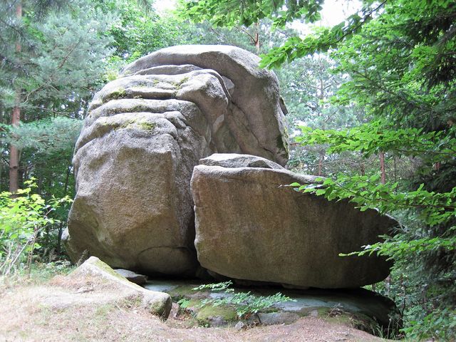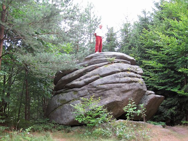 Žulový balvan byl vymodelován erozí a zvětráváním, je vysoký asi pět metrů, stejně široký, dlouhý sedm metrů. Na vrcholové plošině jsou dvě velké skalní mísy, snad půl metru hluboké, obě stále vodou naplněné – což musel Mirek zkontrolovat. 🙂