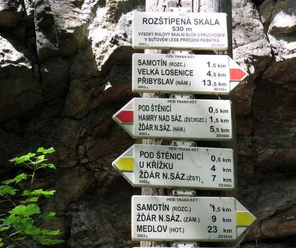 Na Rozštípené skále byli jako vždycky horolezci, kterým jsem, jako vždycky, záviděla jejich mládí a schopnosti… Jediné, co mohu z lokální nabídky aktivně využít, jsou směrové tabulky na skále :-); po žluté značce jsme se vydali zpět do Žďáru.