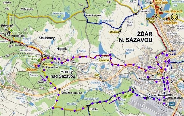 Trasa: Žďár – Hamroň – rybník Dívka – Rozštípená skála – Šlakhamr – Mamut ŽTZ – Česká Mez – U Křížku MTZ – Žďár žst – okružní cesta městem = 15 km