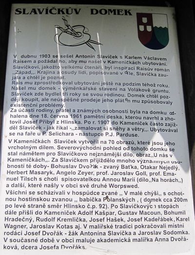 jsme došli k domu, který nazývají Galerií Antonína Slavíčka. Ačkoliv nebyly právě návštěvní hodiny, měli jsme štěstí, že nám milá paní odemkla místnost, kde bylo bohužel jen málo jeho obrazů, ale množství zpráv a údajů nejen o Slavíčkovi, ale i o Raisovi. Dozvěděli jsme se, že v Kameničkách se narodili a celý život tvořili malíři Josef Dvořák, Jaroslav Sodomka, žil tu Karel Wagner a další; vytvořili zde oázu umění, dodneška vyhledávanou.