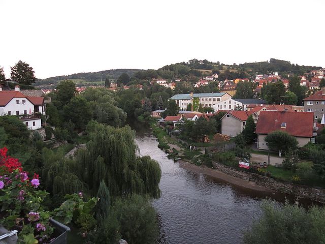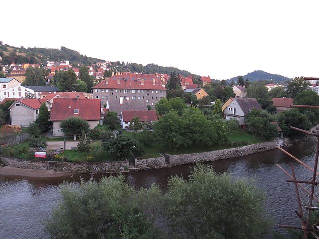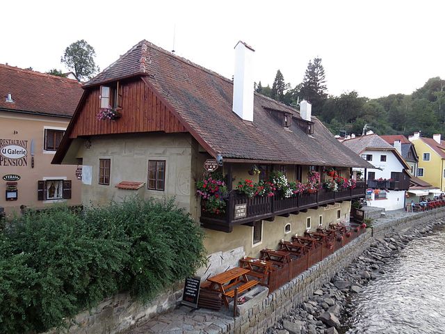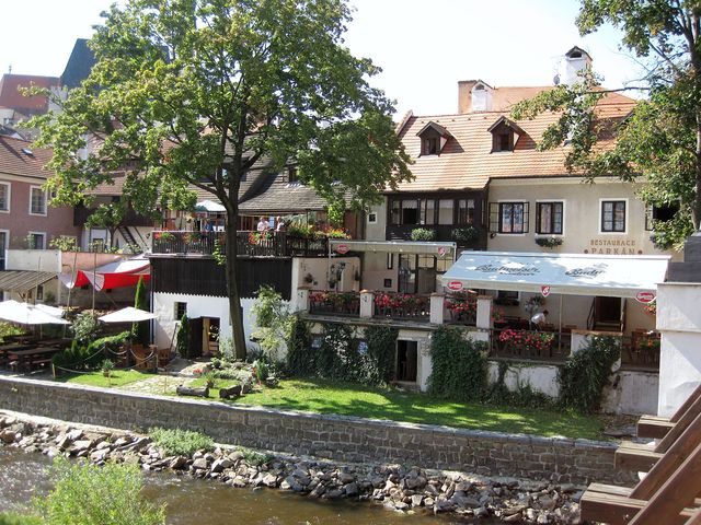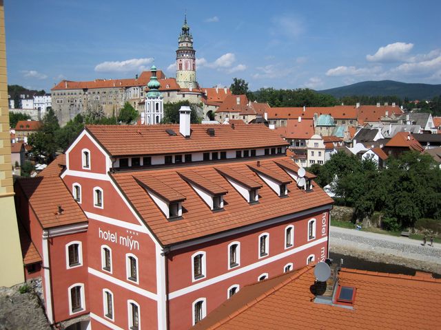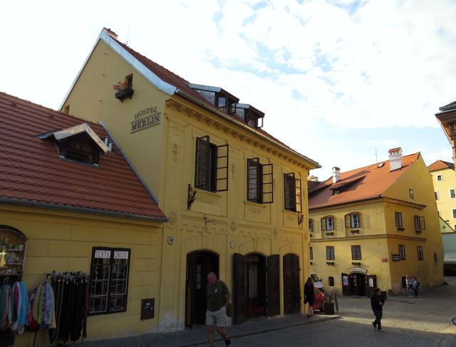 od něhož je co by kamenem dohodil most přes řeku. Zde je vyhlídka na Mrázkův mlýn, ale především na „náš“ hostel – to je ten žlutý s pavlačemi, má číslo 57 a 59.