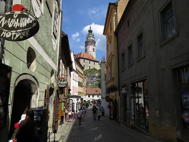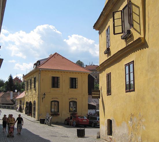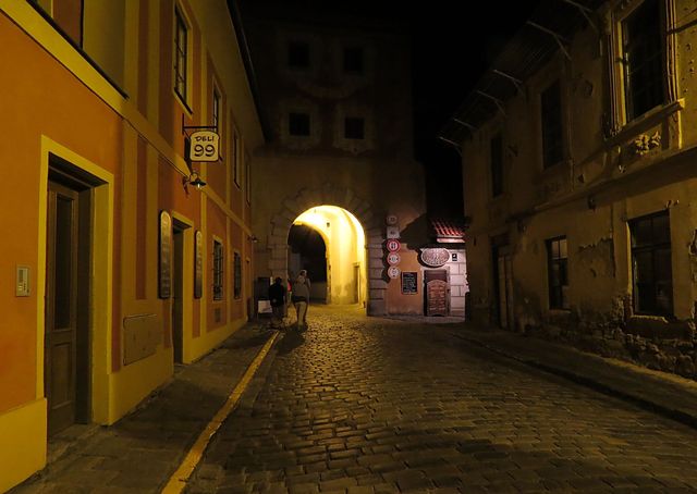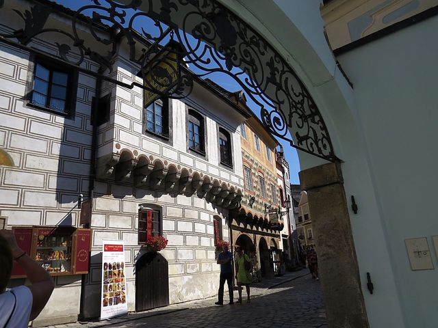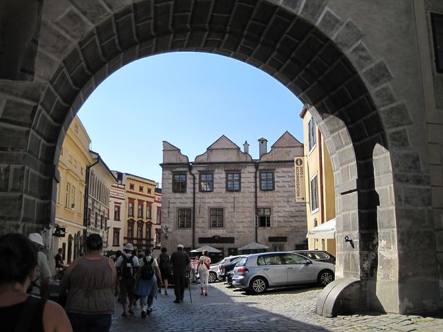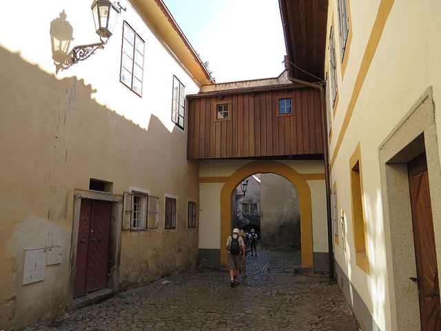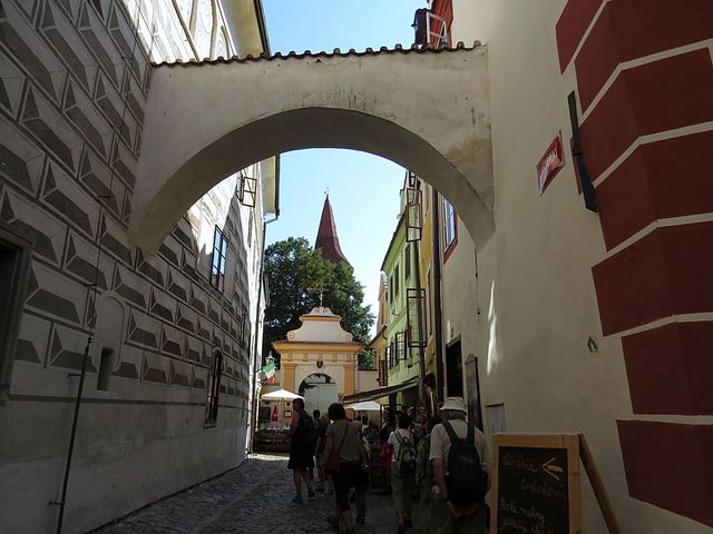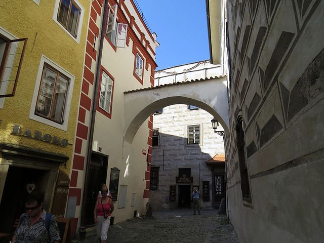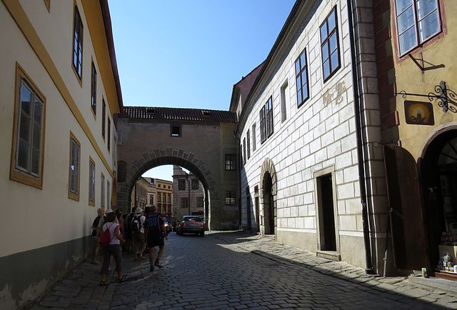 Nad ulicí je spojovací chodba, vlastně brána, kterých najdeme v Krumlově několik.