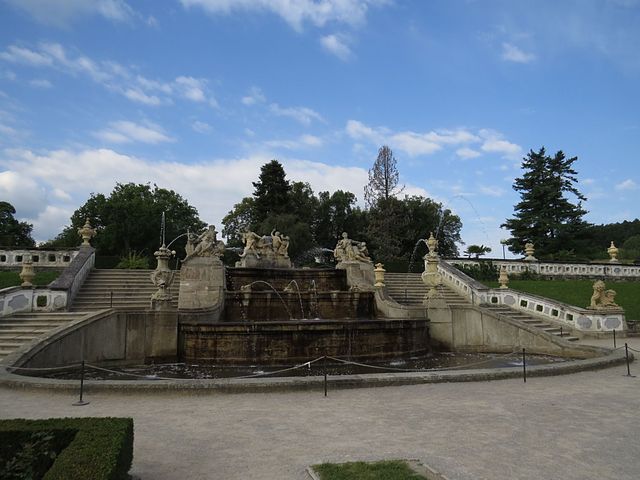 Známá kaskádová fontána se sochami vodních božstev vznikla v polovině 18. století a její předlohou byly pravděpodobně fontány ve vídeňském Belvederu. Schodiště a balustráda s množstvím dekorativních váz a sochami Neptuna, Nymfy Galatei, Nymfy s perlou, Žábami a Rybami z mušlového vápence oddělují horní zahradu od ostatních částí.