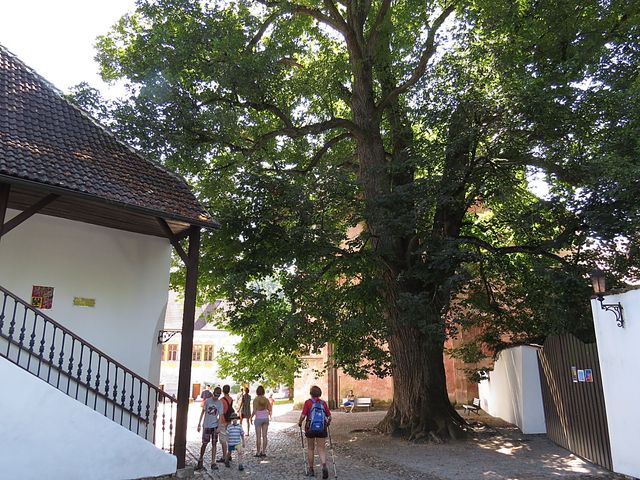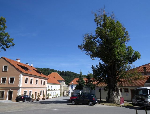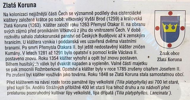 a odtud do Zlaté Koruny, kde nás přivítala památná lípa, podle legendy prý s některými zvláštně tvarovanými listy, které se objevily po roce 1420, kdy na jejích větvích oběsili mnichy, dopadené při husitském řádění a vypálení kláštera – jestli se dosud vyskytují listy ve tvaru mnišských kápí jsme ale bohužel nerozeznali kvůli výšce stromu a velké frekvenci dopravní na přilehlé silnici.