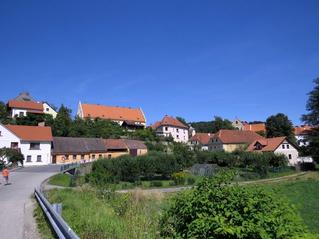 Trochu jsme kufrovali kvůli zpupnému otočení směrové šipky nějakým kazisvětem na okraji golfového hřiště u Svachovy Lhotky, ale nakonec jsme úspěšně dorazili do Chabičovic, o nichž píše pan Wimmer v Knížce vandrovní, že název vznikl jako ves lidí Chabičových a pochází od slova chabiti, tedy kaziti, lapiti, okrádati nebo šiditi – no vida, funguje to tu doposud!!