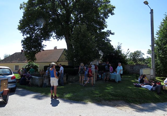 Pořadatelé přesně odhadli, že v Černicích bude naše touha po kafíčku vrcholit a navíc zdejší náves s kašnou, kostelem a křížem z roku 1951 (!) je vhodnou kulisou, kde strávit chvíli odpočinku a prohodit pár slov s kamarády.