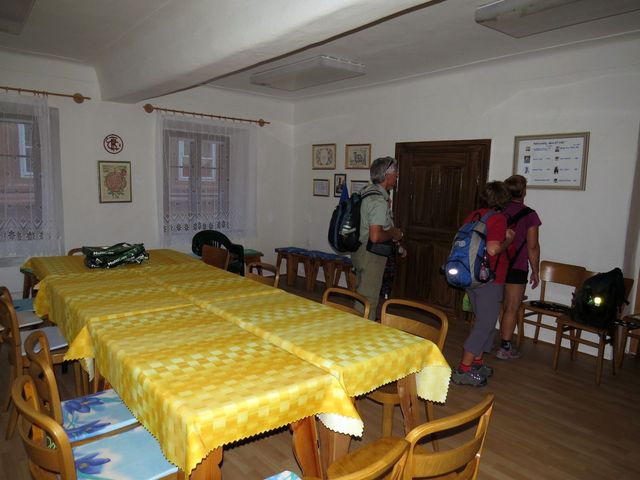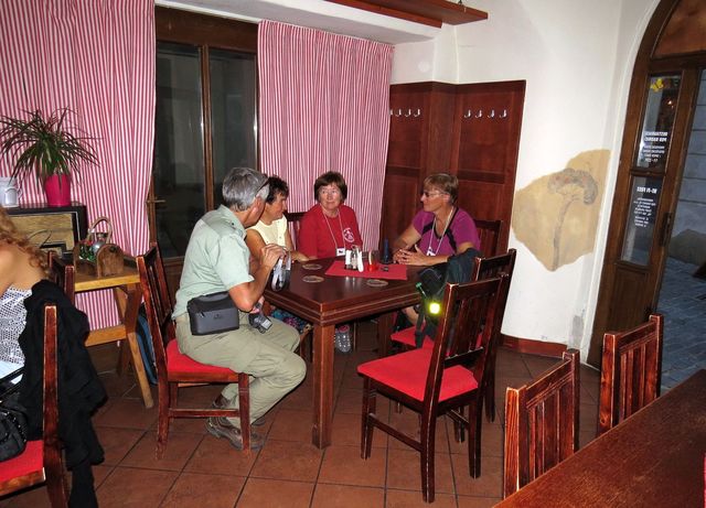Po večeři se nám věnovala předsedkyně odboru Libuška Kuchtová a provedla nás domem v centru města, který patří OKČT Český Krumlov – nevycházeli jsme z údivu nad jeho pestrou historií, nad prací, kterou tu místní turisté odvedli, i nad současným děním v jejich odboru.
