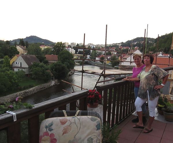 Na dnešní večer jsme měli ještě jedno milé pozvání – podívat se na řeku a město z jiného stanoviště – totiž z terasy domu, kde bydlí Jaruška Kölblová – rychle jsme odložili ruksaky v hostelu Merlin a přes most zamířili ke schodům, kudy je možné dostat se do staré zástavby na svazích nad Vltavou. V rychlosti jsme hodili očkem po velmi fotogenickém objektu u řeky, který kdysi sloužíval většinou jirchářům, dnes je zde voňavá cukrárna a kavárna.