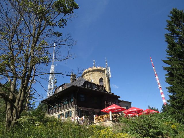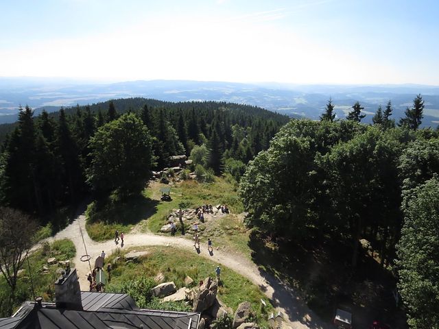 Inkasovali jsme nezbytné kontrolní razítko i zápis do záznamníku Vystup na svůj vrchol a chutě vykročili po dřevěném schodišti na vyhlídkovou plošinu schwarzenberské Josefovy rozhledny z roku 1825, nejstarší kamenné rozhledny v Čechách.