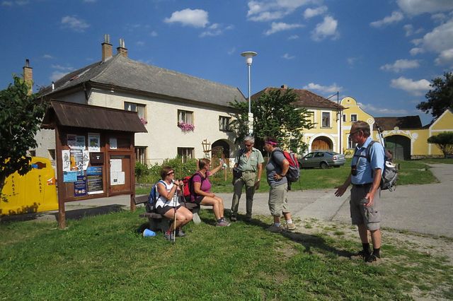 V Černicích jsme se začali řídit žlutým značením, abychom naplnili téma dnešního dne a došli ke vzpomínkovému místu na významnou osobnost krumlovskou.