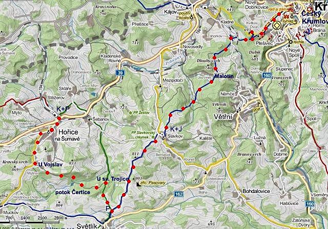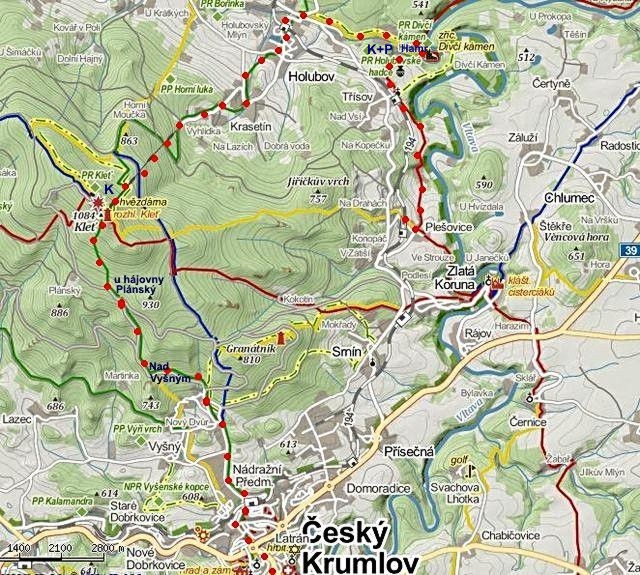 Trasa: Český Krumlov ZTZ – Kleť – Krasetín – Holubov ŽTZ – Dívčí Kámen ČTZ – Třísov – Plešovice = 22 km