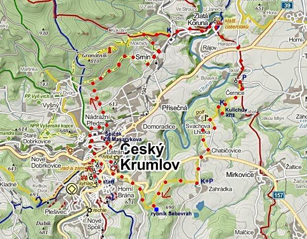 Trasa: Český Krumlov – Nový Dvůr – NS Granátník – Srnín ČTZ – Zlatá Koruna – Černice ŽTZ – kříž MUDr. Kulicha – Chabičovice – Zahrádky – Český Krumlov = 24 km