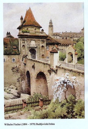Mnohem lepší kvality je obrázek, který nám nabízí Průvodce – Wilhelm Fischer vymaloval Budějovickou bránu kdysi zjara, vidíme, že most je na skalisku; teď nastal čas připomenout, že v kapličce, otočené k nám zády je Kristus bičovaný z bývalé kaple na Trojani, která stávala na rozcestí u sv. Trojice, kudy jsme šli první den při „růžovém“ putování. 🙂