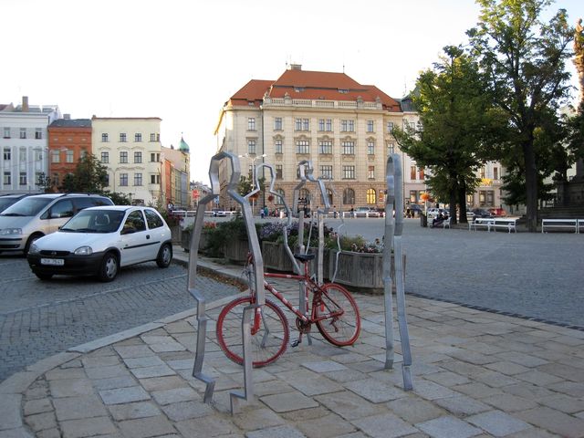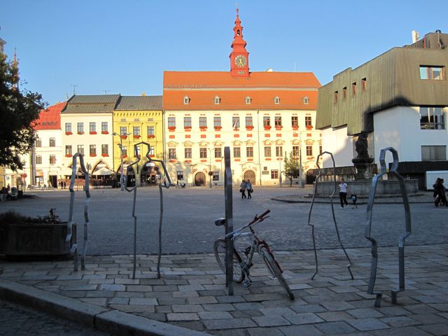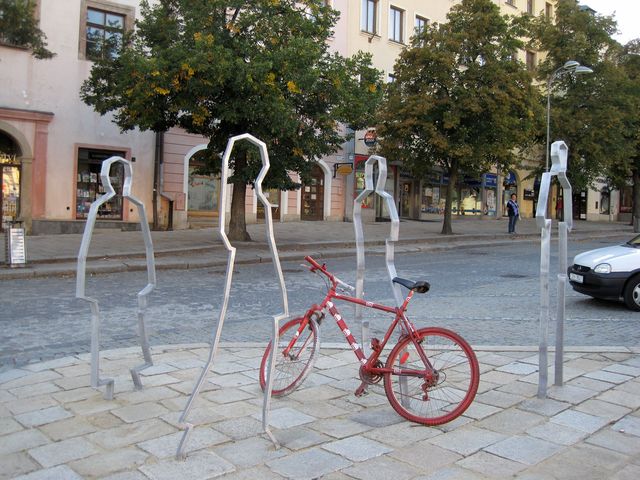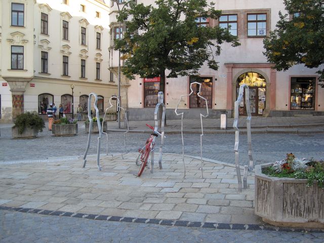 Tím jsme se dostali do centra města, které s historií za zády žije samozřejmě současností – tou nejžhavější, týkající se turistů, je instalace kovových stojanů na kola v podobě lidských siluet. Když byly první korpusy letos v červenci instalovány, řekl o nich s úsměvnou nadsázkou jejich tvůrce, architekt David Beke, že takový stojan je přítel, o kterého se můžete opřít. Celkem by po dokončení této zkrášlovací a užitečné akce mělo být po Jihlavě asi padesát netradičních stojanů-figur. Inu, proč ne?