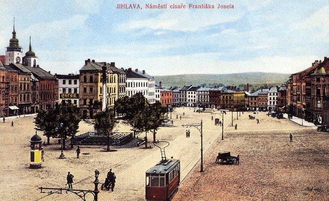 Na kresbě je zachycena tramvaj, která jezdila v Jihlavě od roku 1909 (do 1948) na jediné trati spojující centrum města s hlavním nádražím, asi tři kilometry vzdáleným (první vlak byl z jihlavského nádraží vypraven v roce 1870).