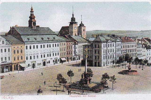 Na staré pohlednici z roku 1900 kolující v různých prezentacích, je v popředí mariánský sloup, postavený na náklady Dr. Jakuba Jindřicha Kielmana roku 1690 v místě, kde na horním náměstí stával pranýř, jako poděkování za ochranu před morem, který město postihl roku 1679. Dále na obrázku vidíme radnici (s jednou věžičkou), dvě nestejně vysoké věže patří kostelu sv. Jakuba Většího, soubor domů na náměstí je výše zmiňovaný Krecl (něm. Kretzel). Vedle Kreclu je kašna se sochou Poseidona, další kašna se sochou Amfitrité (manželka Poseidona) je na dolním náměstí. Kašny byly postaveny v 16. století a na konci století 18. je upravil a sochami vyzdobil kroměřížský rodák usazený v Jihlavě, Jan Václav Prchal (1714–1811).