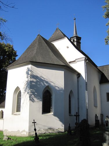 Když se v okolí osady našlo stříbro, vzniklo opodál město, neboť příliv obyvatelstva chtivého těžby stříbronosných rud byl značný. Kostel na obrázku je z konce 16. století (předchozí byl válkami zcela zničen), má renesanční štít. Při vstupu do interiéru jsme si se zájmem prohlídli žebrovou hvězdicovou klenbu a v nedávné době obnovené nástěnné malby z doby vzniku stavby.