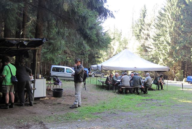 Jdeme tichou lesní cestou, obdivujeme mechové polštáře a očima z nich vytahujeme houby, najednou na plácku vedle křižovatky cest, poblíž Pelestrovské hospůdky, švarní myslivci v počtu hojném, se psy po boku – s obdivem jsme hleděli na tu nečekanou ladnou skupinu. Zjistili jsme, že se tu konají zkoušky ohařů – majitelé byli náramně hrdí na svoje šikovné čtyřnohé miláčky. Po testech způsobilosti a zdatnosti psů bylo třeba, aby páníčkové řádně probrali ukončenou akci a odměnili se za přestálé nervové vypětí. K tomu účelu byly zde vybudovány stany s občerstvením na mnohý způsob