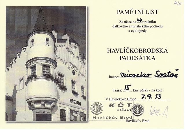 kterým jsme sdělili úžasné zážitky z trasy a oni nám oplátkou předložili statistiku akce: jak jsem uvedla na začátku článku, padesátku ušlapalo devět turistů, deset turistů si vybralo trasu dlouhou 35 km, devět jich pádilo cestou-necestou 25 km, nejpočetněji byla obsazená trasa 15 km – 52 účastníky; 36 lidí se vydalo na vycházku v délce osm kilometrů.