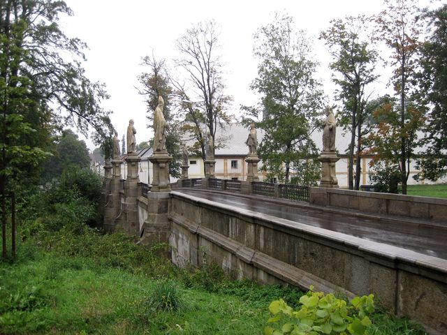 Po mostě, poblíž něj stojí socha sv. Jana Nepomuckého, byl hlavní přístup ke klášteru, také stavebně upraveném Santinim. Když byl v roce 1784 prosperující klášter zrušen, sloužily budovy jako zámek, který dnes patří Kinským.