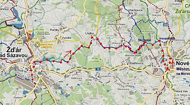 Vybrali jsme trasu v celkové délce 18 kilometrů: MTZ Žďár, nádraží ČD – Palachova ZŠ – Lhotka – Jiříkovice – Harusův kopec – Ski hotel – koupaliště ZTZ – Nové Město – vycházka centrem Nového Města.