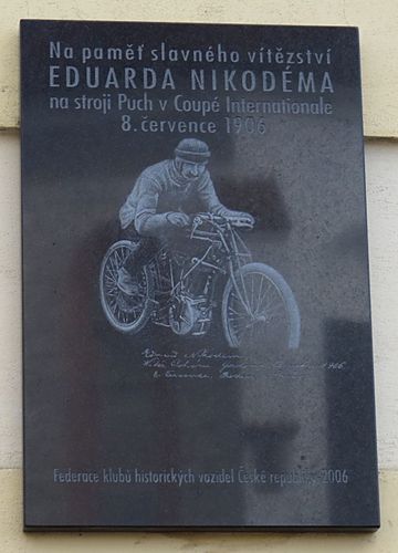je pamětní deska vítězi motocyklových závodů Eduardu Nikodémovi, která sem byla umístěna při příležitosti stého výročí jeho slavného vítězství na stroji značky Puch.