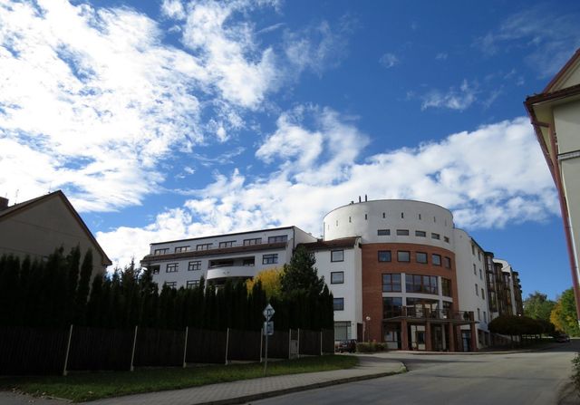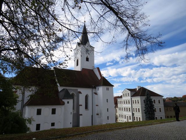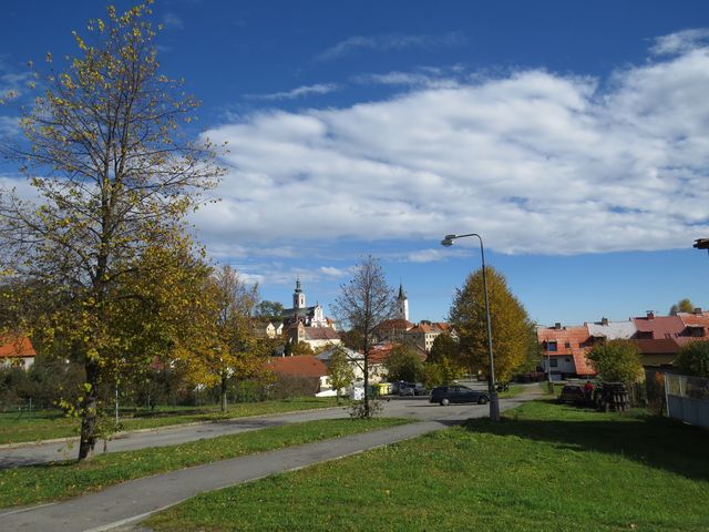Z bodu, odkud jsme mohli nahlédnout do historie, jsme popatřili i na přítomnost (či budoucnost) – ta nám ukázala budovu zdejšího domova důchodců a dramatická oblaka nad ní. 🙂