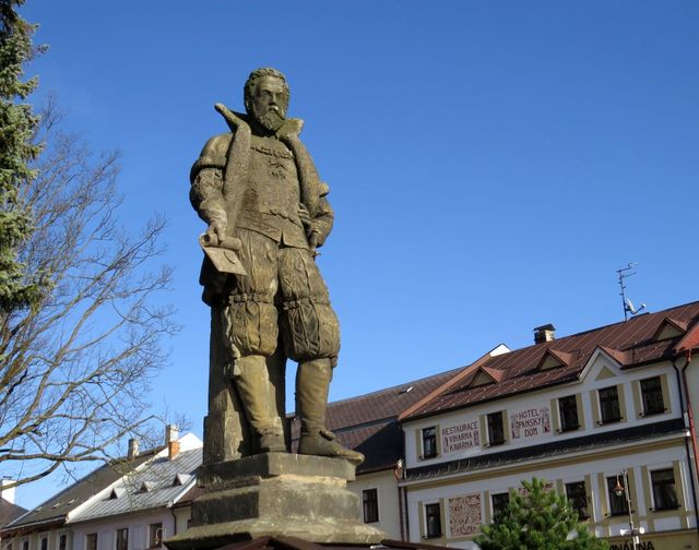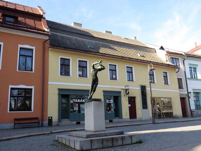 Po pár krocích stojíme před rodným domem sochaře, jehož jméno skloňujeme v poslední půlhodince ve všech pádech – bronzová plastika Raněný umístěná sem v roce 1965 spolehlivě zastaví všechny příchozí a upozorní je na dům, kde se v roce 1880 narodil Jan Štursa.
